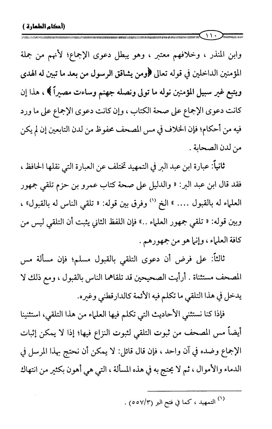 وابن المنذر، وخلافهم معتبر، وهو يبطل دعوى الإجماع؛ لأنهم من جملة المؤمنين الداخلين في قوله تعالى {وَمَنْ يُشَاقِقِ الرَّسُولَ مِنْ بَعْدِ مَا تَبَيَّنَ لَهُ الْهُدَى وَيَتَّبِعْ غَيْرَ سَبِيلِ الْمُؤْمِنِينَ نُوَلِّهِ مَا تَوَلَّى وَنُصْلِهِ جَهَنَّمَ وَسَاءَتْ مَصِيرًا}، هذا إن كانت دعوى الإجماع على صحة الكتاب، وإن كانت دعوى الإجماع على ما ورد فيه من أحكام؛ فإن الخلاف في مس المصحف محفوظ من لدن التابعين إن لم يكن من لدن الصحابة.