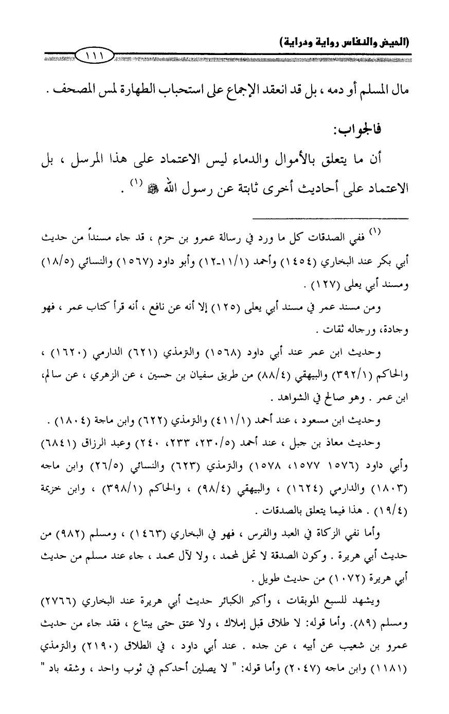 أن ما يتعلق بالأموال والدماء ليس الاعتماد على هذا المرسل، بل الاعتماد على أحاديث أخرى ثابتة عن رسول الله - صلى الله عليه وسلم - (¬1).