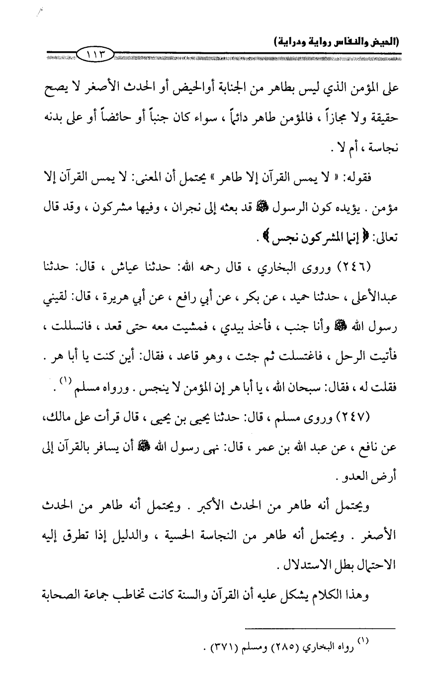 (246) وروى البخاري، قال رحمه الله: حدثنا عياش، قال: حدثنا عبد الأعلى، حدثنا حميد، عن بكر، عن أبي رافع، عن أبي هريرة، قال: لقيني رسول الله - صلى الله عليه وسلم - وأنا جنب، فأخذ بيدي، فمشيت معه حتى قعد، فانسللت، فأتيت الرحل، فاغتسلت ثم جئت، وهو قاعد، فقال: أين كنت يا أبا هر. فقلت له، فقال: سبحان الله، يا أبا هر إن المؤمن لا ينجس. ورواه مسلم (¬1).