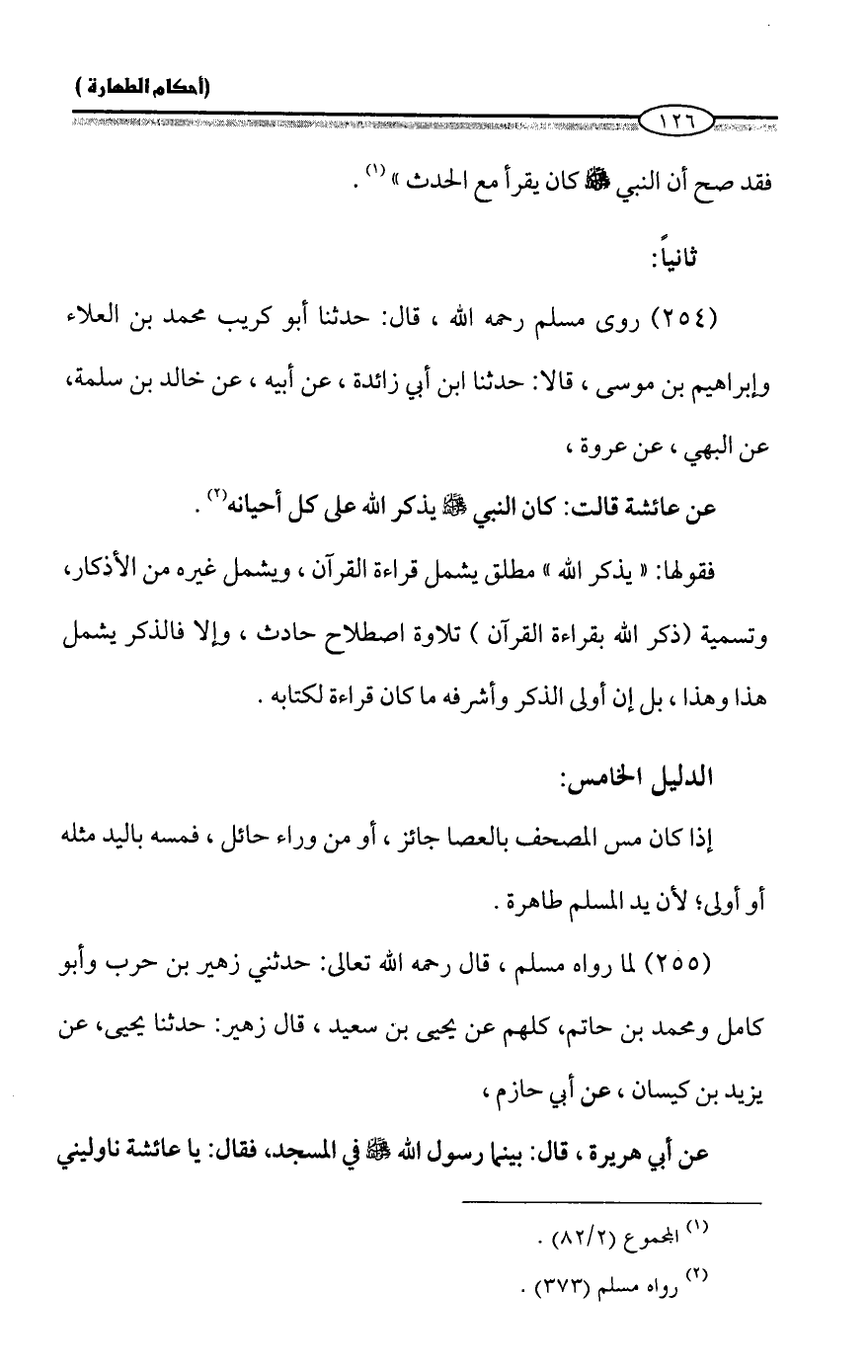 (254) روى مسلم رحمه الله، قال: حدثنا أبو كريب محمّد بن العلاء وإبراهيم بن موسى، قالا: حدثنا ابن أبي زائدة، عن أبيه، عن خالد بن سلمة، عن البهي، عن عروة،