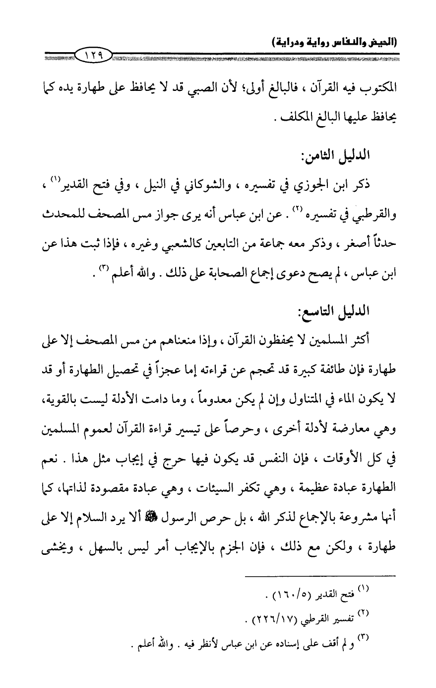 ذكر ابن الجوزي في تفسيره، والشوكاني في النيل، وفي فتح القدير (¬1)، والقرطبي في تفسيره (¬2). عن ابن عباس أنه يرى جواز مس المصحف للمحدث حدثاً أصغر، وذكر معه جماعة من التابعين كالشعبي وغيره، فإذا ثبت هذا عن ابن عباس، لم يصح دعوى إجماع الصحابة على ذلك. والله أعلم (¬3).