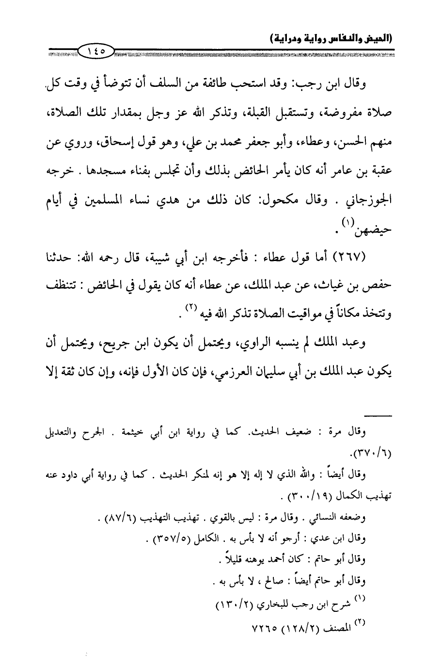 (267) أما قول عطاء: فأخرجه ابن أبي شيبة، قال رحمه الله: حدثنا حفص بن غياث، عن عبد الملك، عن عطاء أنه كان يقول في الحائض: تتنظف وتتخذ مكاناً في مواقيت الصلاة تذكر الله فيه (¬2).