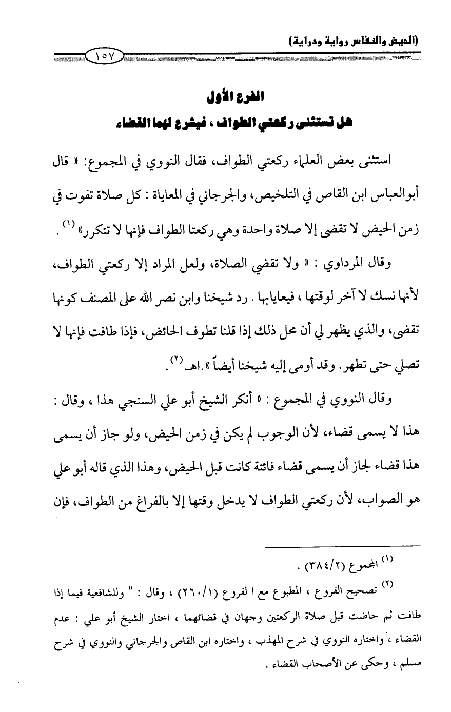 (¬2) تصحيح الفروع، المطبوع مع الفروع (1/ 260)، وقال: "الشافعية فيما إذا طافت ثم حاضت قبل صلاة الركعتين وجهان في قضائهما، اختار الشيخ أبو علي: عدم القضاء، واختاره النووي في شرح المهذب، واختاره ابن القاص والجرجاني والنووي في شرح مسلم، وحكى عن الأصحاب القضاء.