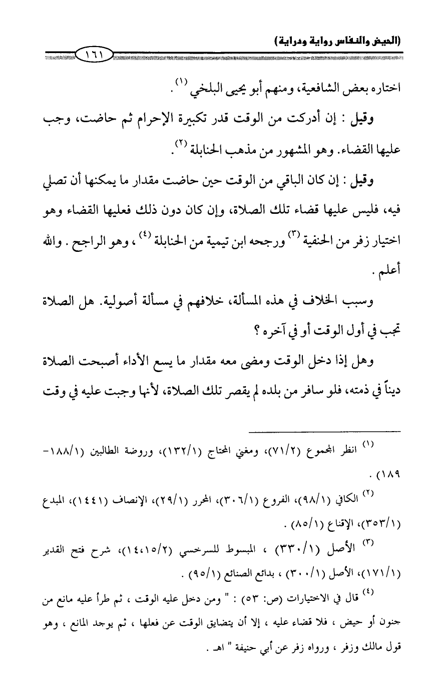 وقيل: إن كان الباقي من الوقت حين حاضت مقدار ما يمكنها أن تصلي فيه، فليس عليها قضاء تلك الصلاة، وإن كان دون ذلك فعليها القضاء وهو اختيار زفر من الحنفية (¬3) ورجحه ابن تيمية من الحنابلة (¬4)، وهو الراجح، والله أعلم.