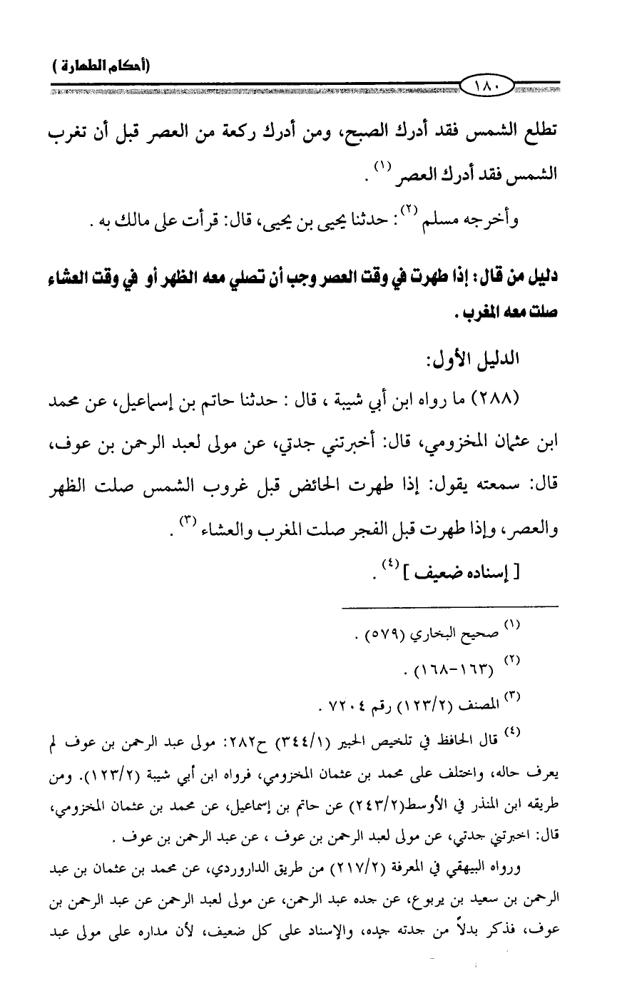 (288) ما رواه ابن أبي شيبة، قال: حدثنا حاتم بن إسماعيل، عن محمد ابن عثمان المخزومي، قال: أخبرتني جدتي، عن مولى لعبد الرحمن بن عوف، قال: سمعته يقول: إذا طهرت الحائض قبل غروب الشمس صلت الظهر والعصر، وإذا طهرت قبل الفجر صلت المغرب والعشاء (¬3).