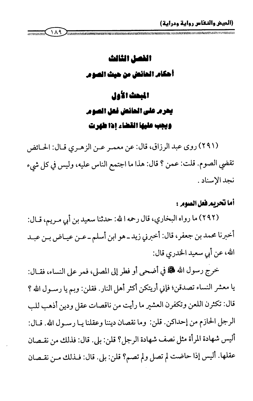(291) روى عبد الرزاق، قال: عن معمر عن الزهري قال: الحائض تقضي الصوم. قلت: عمن؟ قال: هذا ما اجتمع الناس عليه، وليس في كل شيء نجد الإسناد.