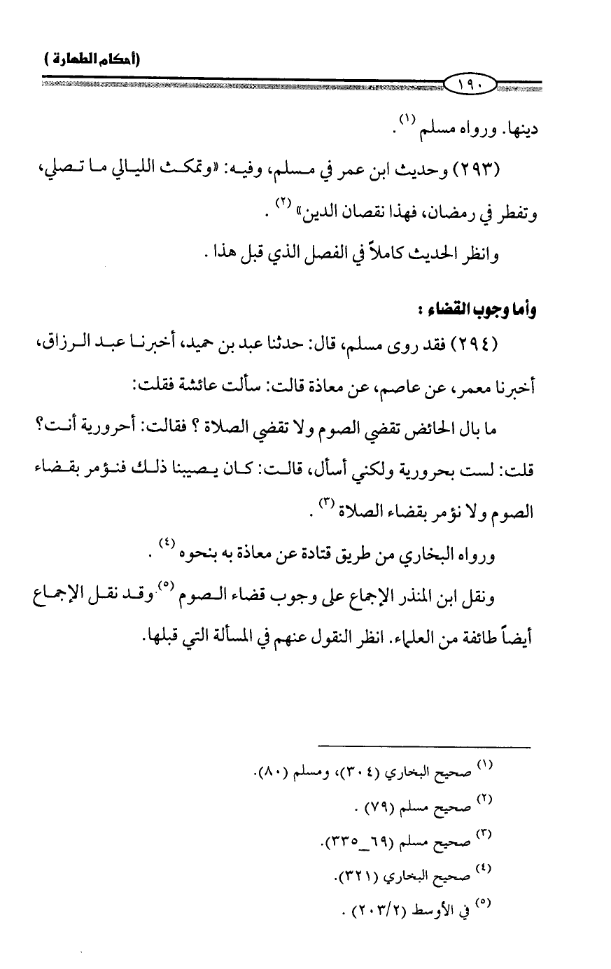 (294) فقد روى مسلم، قال: حدثنا عبد بن حميد، أخبرنا عبد الرزاق، أخبرنا معمر، عن عاصم، عن معاذة قالت: سألت عائشة فقلت: