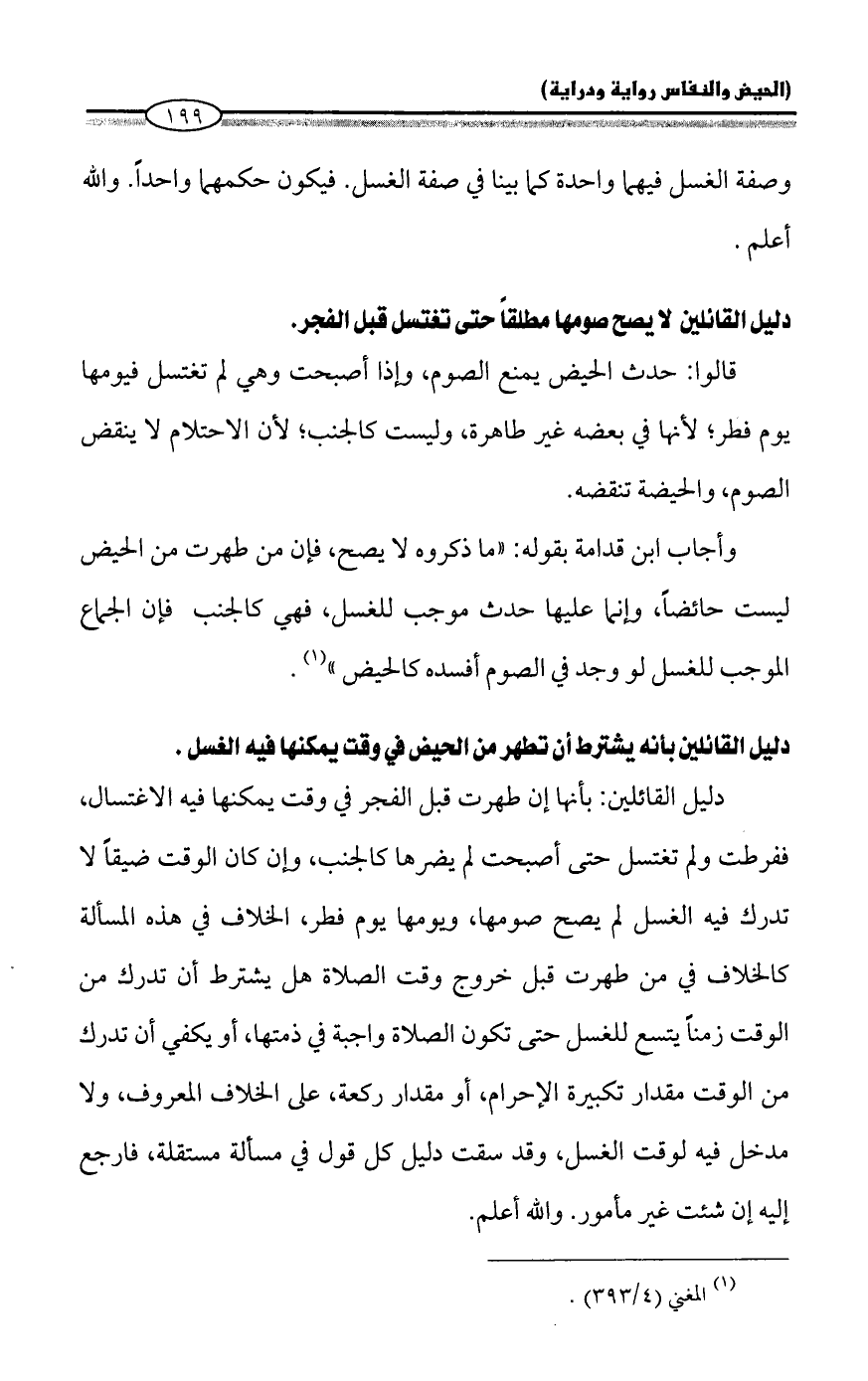 وأجاب ابن قدامة بقوله: "ما ذكروه لا يصح، فإن من طهرت من الحيض ليست حائضاً، وإنما عليها حدث موجب للغسل، فهي كالجنب فإن الجماع الموجب للغسل لو وجد في الصوم أفسده كالحيض" (¬1).