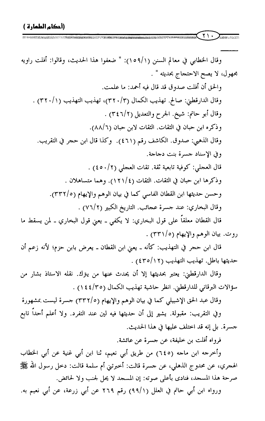 وقال عبد الحق الإشبيلي كما في بيان الوهم والإيهام (5/ 332) جسرة ليست بمشهورة وفي التقريب: مقبولة. يشير إلى أن حديثها فيه لين عند التفرد. ولا أعلم أحداً تابع جسرة. بل إنه قد اختلف عليها في هذا الحديث.