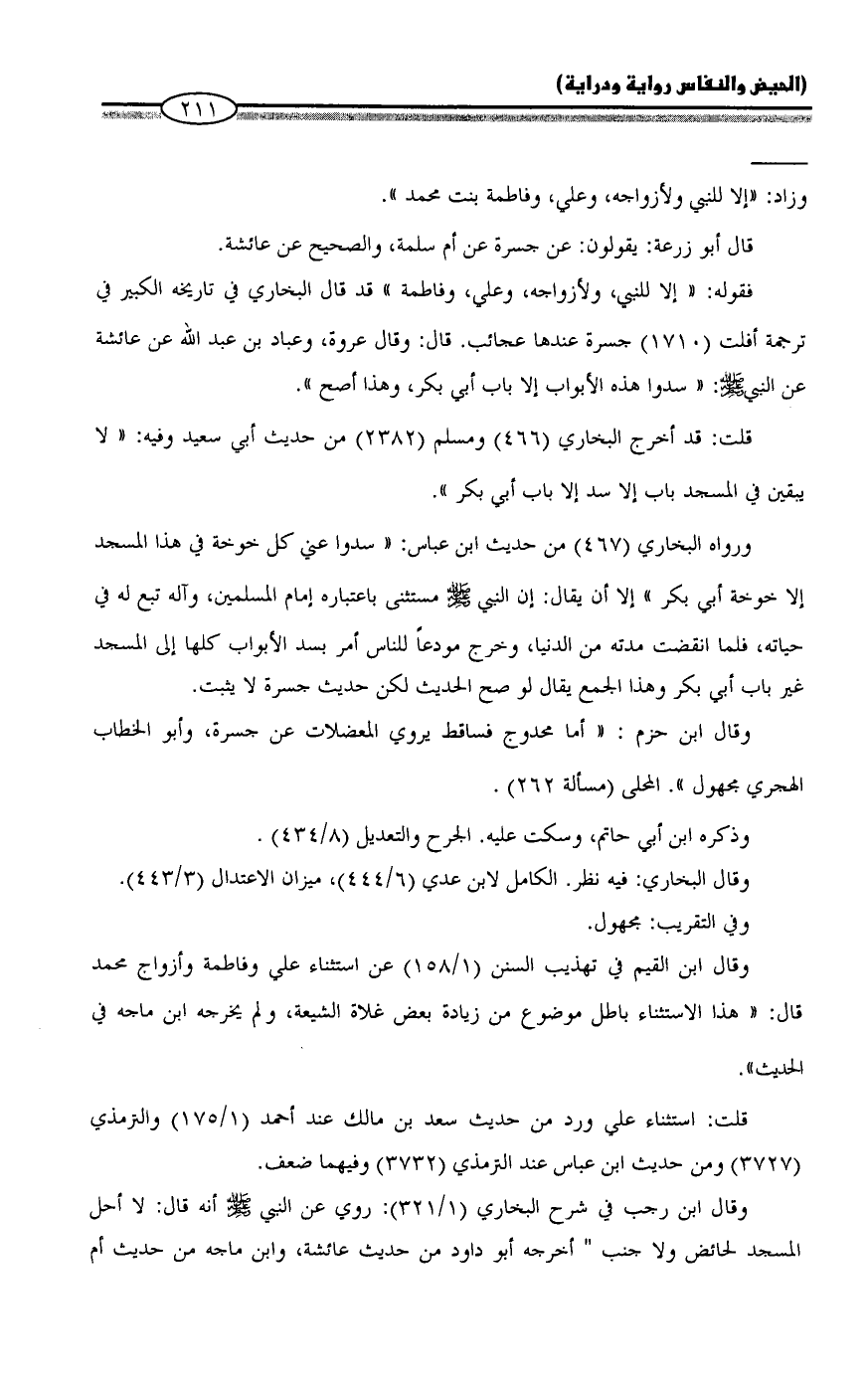 ورواه البخاري (467) من حديث ابن عباس: "سدوا عني كل خوخة في هذا المسجد إلا خوخة أبي بكر" إلا أن يقال: إن النبي - صلى الله عليه وسلم - مستثنى باعتباره إمام المسلمين، وآله تبع له في حياته، فلما انقضت مدته من الدنيا، وخرج مردعاً للناس أمر بسد الأبواب كلها إلى المسجد غير باب أبي بكر وهذا الجمع يقال لو صح الحديث لكن حديث جسرة لا يثبت.