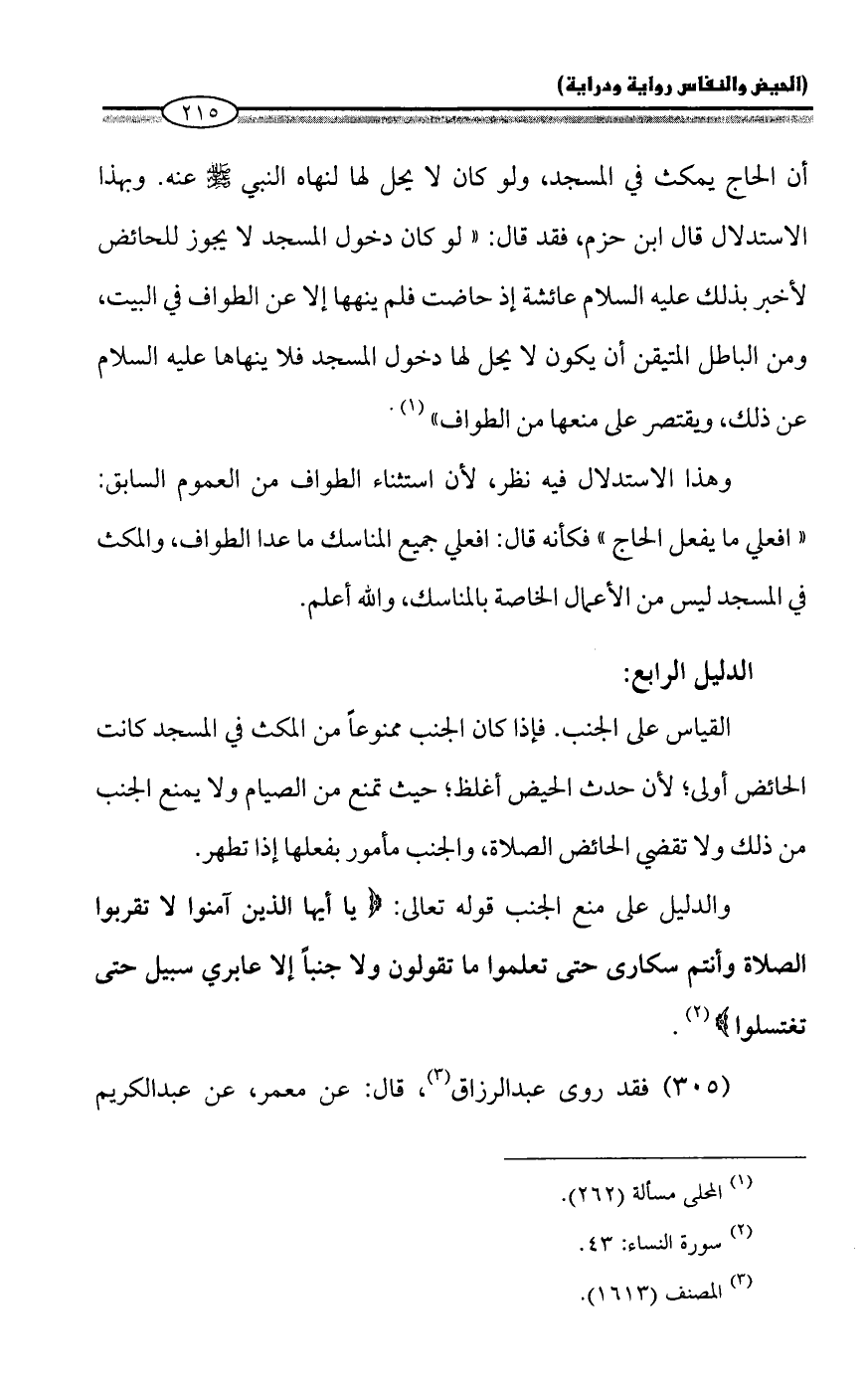 أن الحاج يمكث في المسجد، ولو كان لا يحل لها لنهاه النبي - صلى الله عليه وسلم - عنه. وبهذا الاستدلال قال ابن حزم، فقد قال: "لو كان دخول المسجد لا يجوز للحائض لأخبر بذلك عليه السلام عائشة إذ حاضت فلم ينهها إلا عن الطواف في البيت، ومن الباطل المتيقن أن يكون لا يحل لها دخول المسجد فلا ينهاها عليه السلام عن ذلك، ويقتصر على منعها من الطواف" (¬1).