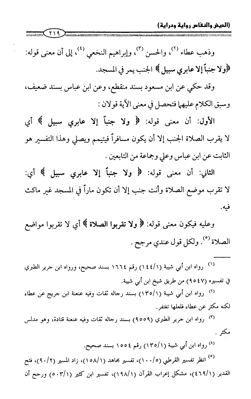 الأول: أن معنى قوله: {وَلَا جُنُبًا إلا عَابِرِي سَبِيلٍ} أي لا يقرب الصلاة الجنب إلا أن يكون مسافراً فيتيمم ويصلي وهذا التفسير هو الثابت عن ابن عباس وعلي وجماعة من التابعين.