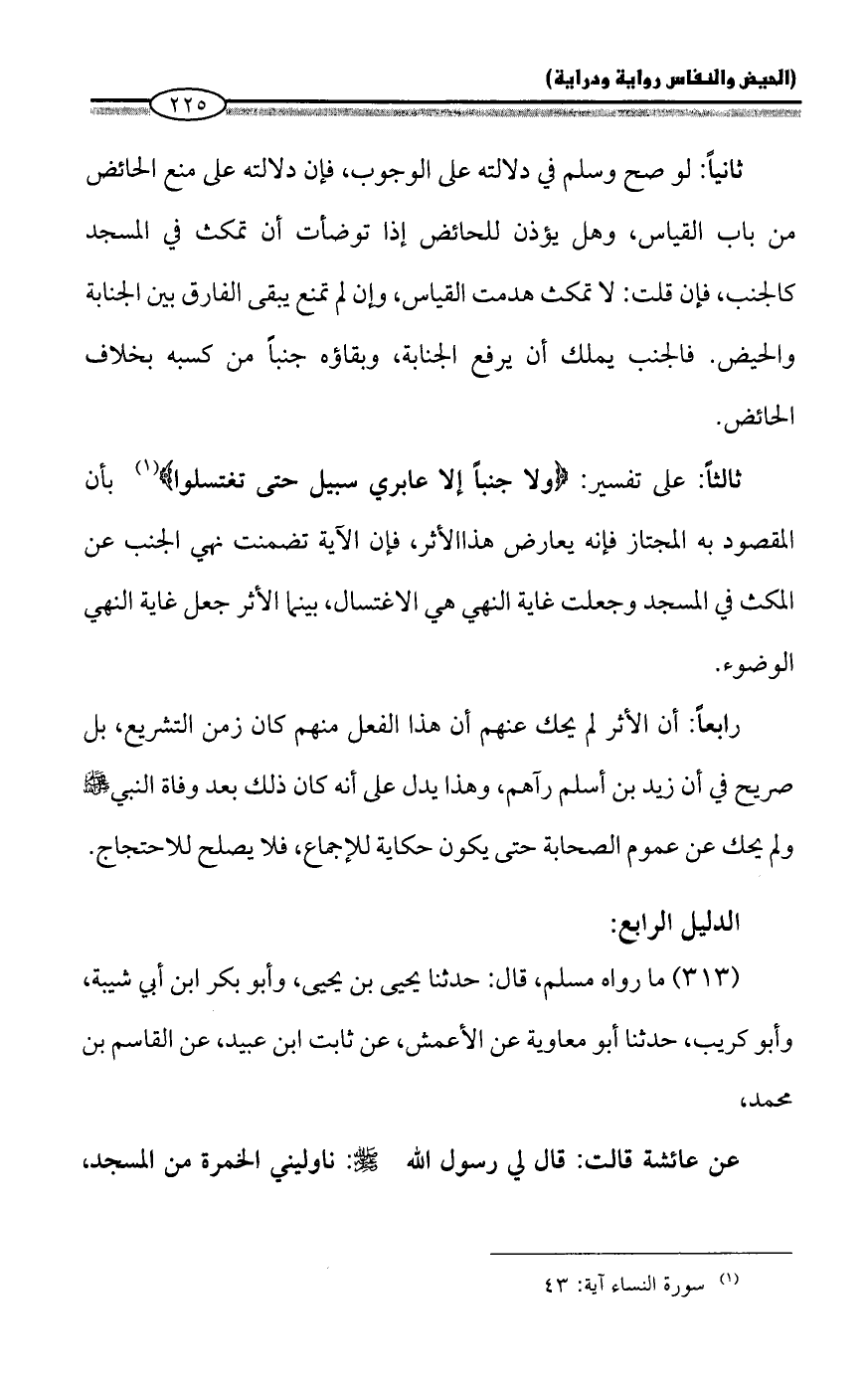ثانياً: لو صح وسلم في دلالته على الوجوب، فإن دلالته على منع الحائض من باب القياس، وهل يؤذن للحائض إذا توضأت أن تمكث في المسجد كالجنب، فإن قلت: لا تمكث هدمت القياس، وإن لم تمنع يبقى الفارق بين الجنابة والحيض. فالجنب يملك أن يرفع الجنابة، وبقاؤه جنباً من كسبه بخلاف الحائض.