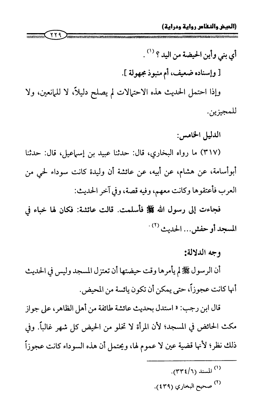 قال ابن رجب: "استدل بحديث عائشة طائفة من أهل الظاهر، على جواز مكث الحائض في المسجد؛ لأن المرأة لا تخلو من الحيض كل شهر غالباً. وفي ذلك نظر؛ لأنها قضية عين لا عموم لها، ويحتمل أن هذه السوداء كانت عجوزاً