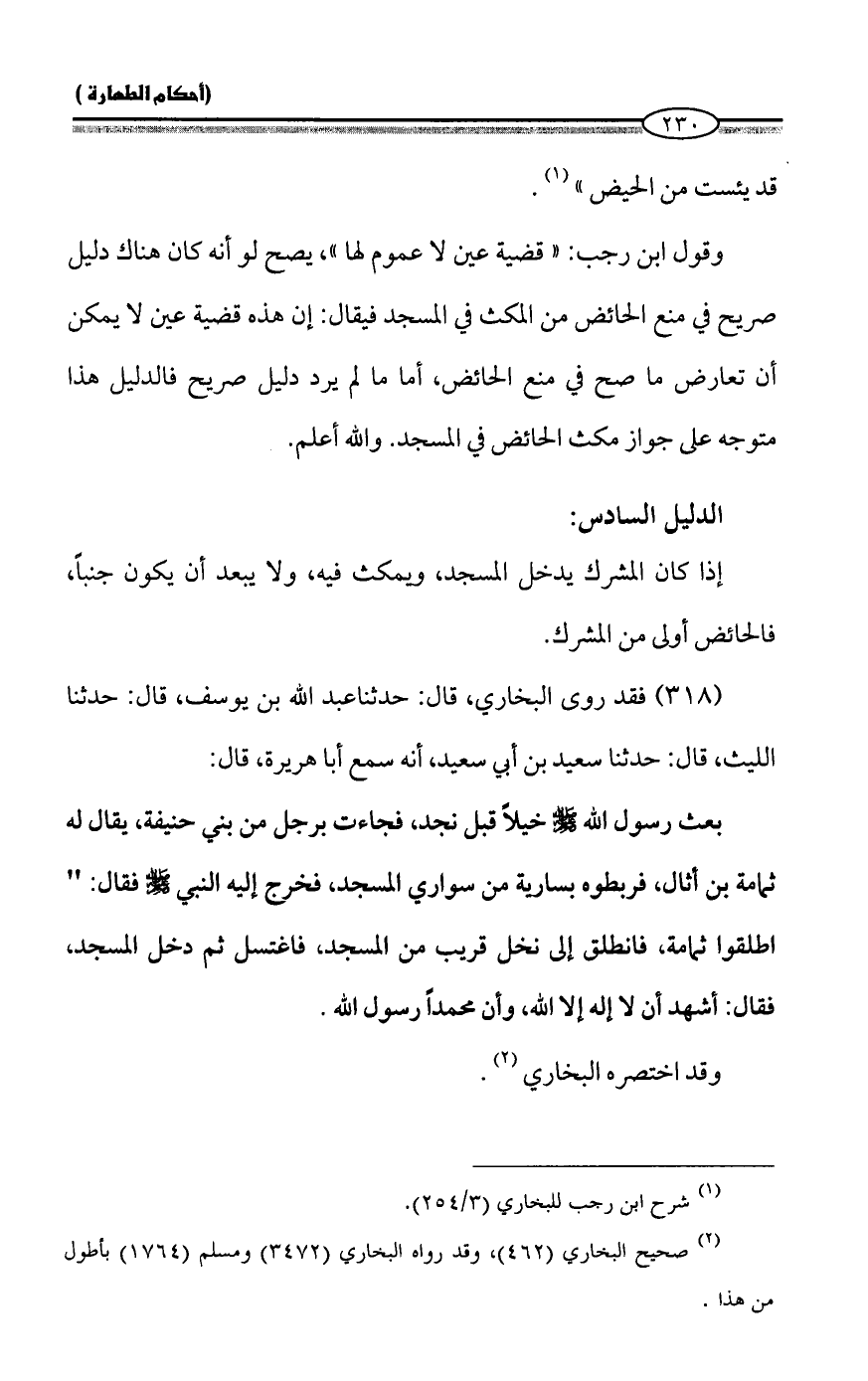 وقول ابن رجب: "قضية عين لا عموم لها"، يصح لو أنه كان هناك دليل صريح في منع الحائض من المكث في المسجد فيقال: إن هذه قضية عين لا يمكن أن تعارض ما صح في منع الحائض، أما ما لم يرد دليل صريح فالدليل هذا متوجه على جواز مكث الحائض في المسجد. والله أعلم.