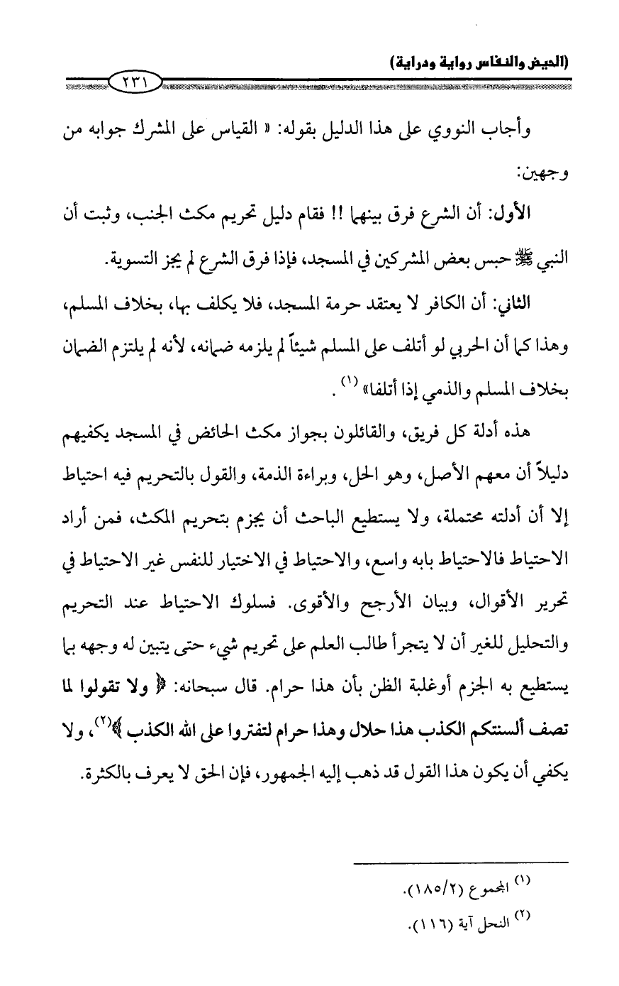 هذه أدلة كل فريق، والقائلون بجواز مكث الحائض في المسجد يكفيهم دليلاً أن معهم الأصل، وهو الحل، وبراءة الذمة، والقول بالتحريم فيه احتياط إلا أن أدلته محتملة، ولا يستطيع الباحث أن يجزم بتحريم المكث، فمن أراد الاحتياط فالاحتياط بابه واسع، والاحتياط في الاختيار للنفس غير الاحتياط في تحرير الأقوال، وبيان الأرجح والأقوى. فسلوك الاحتياط عند التحريم والتحليل للغير أن لا يتجرأ طالب العلم على تحريم شيء حتى يتبين له وجهه بما يستطيع به الجزم أو غلبة الظن بأن هذا حرام. قال سبحانه: {وَلَا تَقُولُوا لِمَا تَصِفُ أَلْسِنَتُكُمُ الْكَذِبَ هَذَا حَلَالٌ وَهَذَا حَرَامٌ لِتَفْتَرُوا عَلَى اللَّهِ الْكَذِبَ} (¬2)، ولا يكفي أن يكون هذا القول قد ذهب إليه الجمهور، فإن الحق لا يعرف بالكثرة.