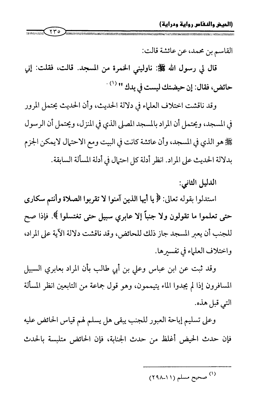 وقد ناقشت اختلاف العلماء في دلالة الحديث، وأن الحديث يحتمل المرور في المسجد، ويحتمل أن المراد بالمسجد المصلى الذي في المنزل، ويحتمل أن الرسول - صلى الله عليه وسلم - هو الذي في المسجد، وأن عائشة كانت في البيت ومع الاحتمال لا يمكن الجزم بدلالة الحديث على المراد. انظر أدلة كل احتمال في أدلة المسألة السابقة.