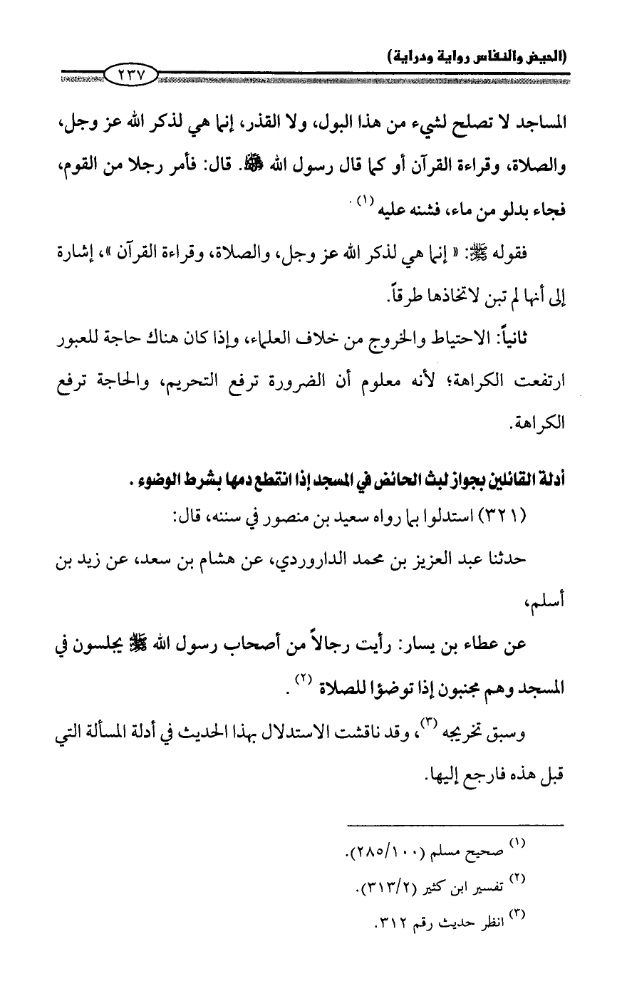 أدلة القائلين بجواز لبث الحائض في المسجد إذا انقطع دمها بشرط الوضوء.
