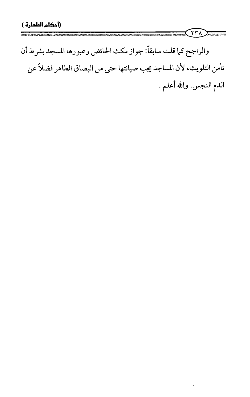 والراجح كما قلت سابقاً: جواز مكث الحائض وعبورها المسجد بشرط أن تأمن التلويث، لأن المساجد يجب صيانتها حتى من البصاق الطاهر فضلاً عن الدم النجس. والله أعلم.