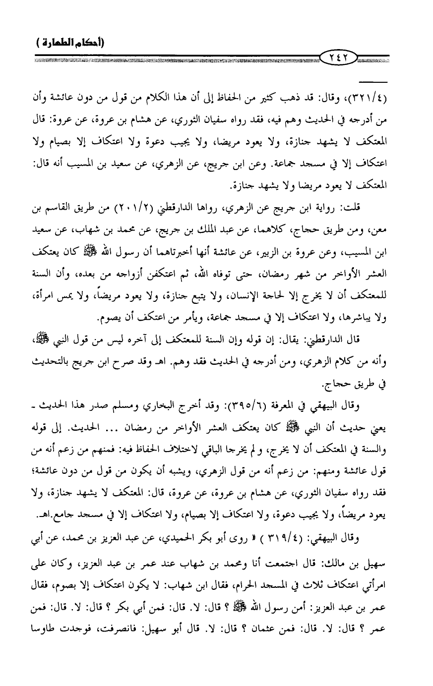 (4/ 321)، وقال: قد ذهب كثير من الحفاظ إلى أن هذا الكلام من قول من دون عائشة وأن من أدرجه في الحديث وهم فيه، فقد رواه سفيان الثوري، عن هشام بن عروة، عن عروة: قال المعتكف لا يشهد جنازة، ولا يعود مريضا، ولا يجيب دعوة ولا اعتكاف إلا بصيام ولا اعتكاف إلا في مسجد جماعة. وعن ابن جريج، عن الزهري، عن سعيد بن المسيب أنه قال: المعتكف لا يعود مريضا ولا يشهد جنازة.
