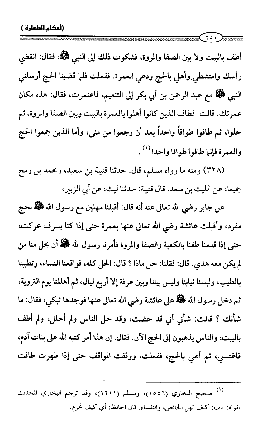 عن جابر رضي الله تعالى عنه أنه قال: أقبلنا مهلين مع رسول الله - صلى الله عليه وسلم - بحج مفرد، وأقبلت عائشة رضي الله تعالى عنها بعمرة حتى إذا كنا بسرف عركت، حتى إذا قدمنا طفنا بالكعبة والصفا والمروة فأمرنا رسول الله - صلى الله عليه وسلم - أن يحل منا من لم يكن معه هدي. قال: فقلنا: حل ماذا؟ قال: الحل كله، فواقعنا النساء، وتطيبنا بالطيب، ولبسنا ثيابنا وليس بيننا وبين عرفة إلا أربع ليال، ثم أهللنا يوم التروية، ثم دخل رسول الله - صلى الله عليه وسلم - على عائشة رضي الله تعالى عنها فوجدها تبكي، فقال: ما شأنك؟ قالت: شأني أني قد حضت، وقد حل الناس ولم أحلل، ولم أطف بالبيت، والناس يذهبون إلى الحج الآن. فقال: إن هذا أمر كتبه الله على بنات آدم، فاغتسلي، ثم أهلي بالحج، ففعلت، ووقفت المواقف حتى إذا طهرت طافت