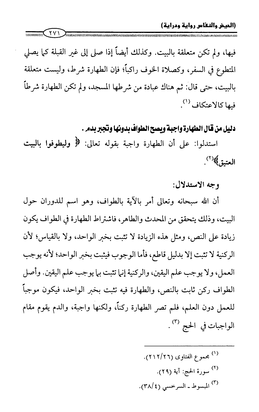 استدلوا: على أن الطهارة واجبة بقوله تعالى: {وَلْيَطَّوَّفُوا بِالْبَيْتِ الْعَتِيقِ} (¬2).