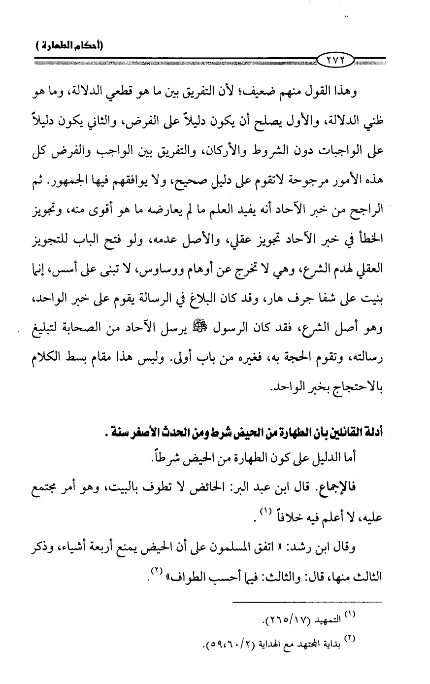 أدلة القائلين بأن الطهارة من الحيض شرط ومن الحدث الأصغر سنة.