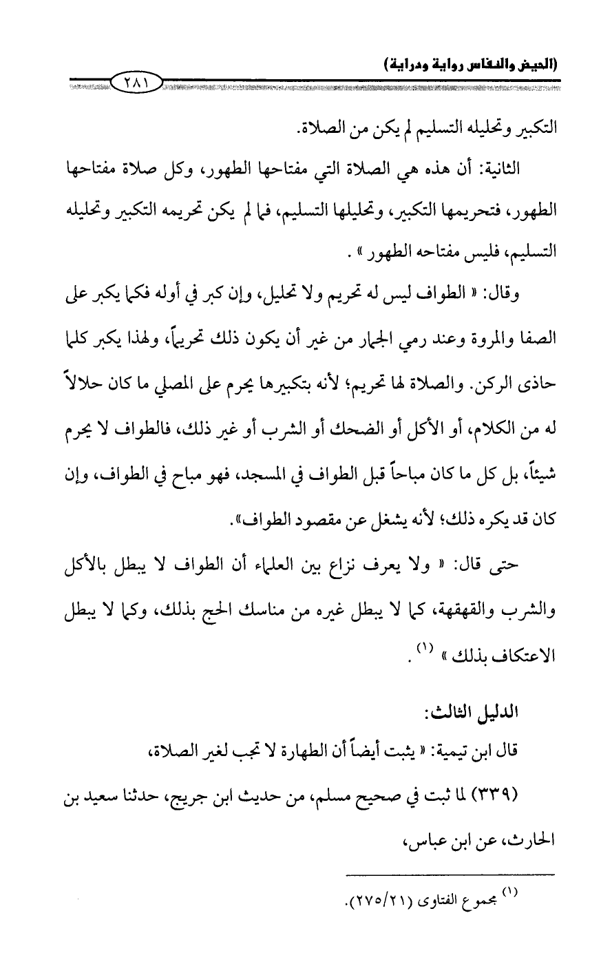 وقال: "الطواف ليس له تحريم ولا تحليل، وإن كبر في أوله فكما يكبر على الصفا والمروة وعند رمي الجمار من غير أن يكون ذلك تحريماً، ولهذا يكبر كلما حاذى الركن. والصلاة لها تحريم؛ لأنه بتكبيرها يحرم على المصلي ما كان حلالاً له من الكلام، أو الأكل أو الضحك أو الشرب أو غير ذلك، فالطواف لا يحرم شيئاً، بل كل ما كان مباحاً قبل الطواف في المسجد، فهو مباح في الطواف، وإن كان قد يكره ذلك؛ لأنه يشغل عن مقصود الطواف".