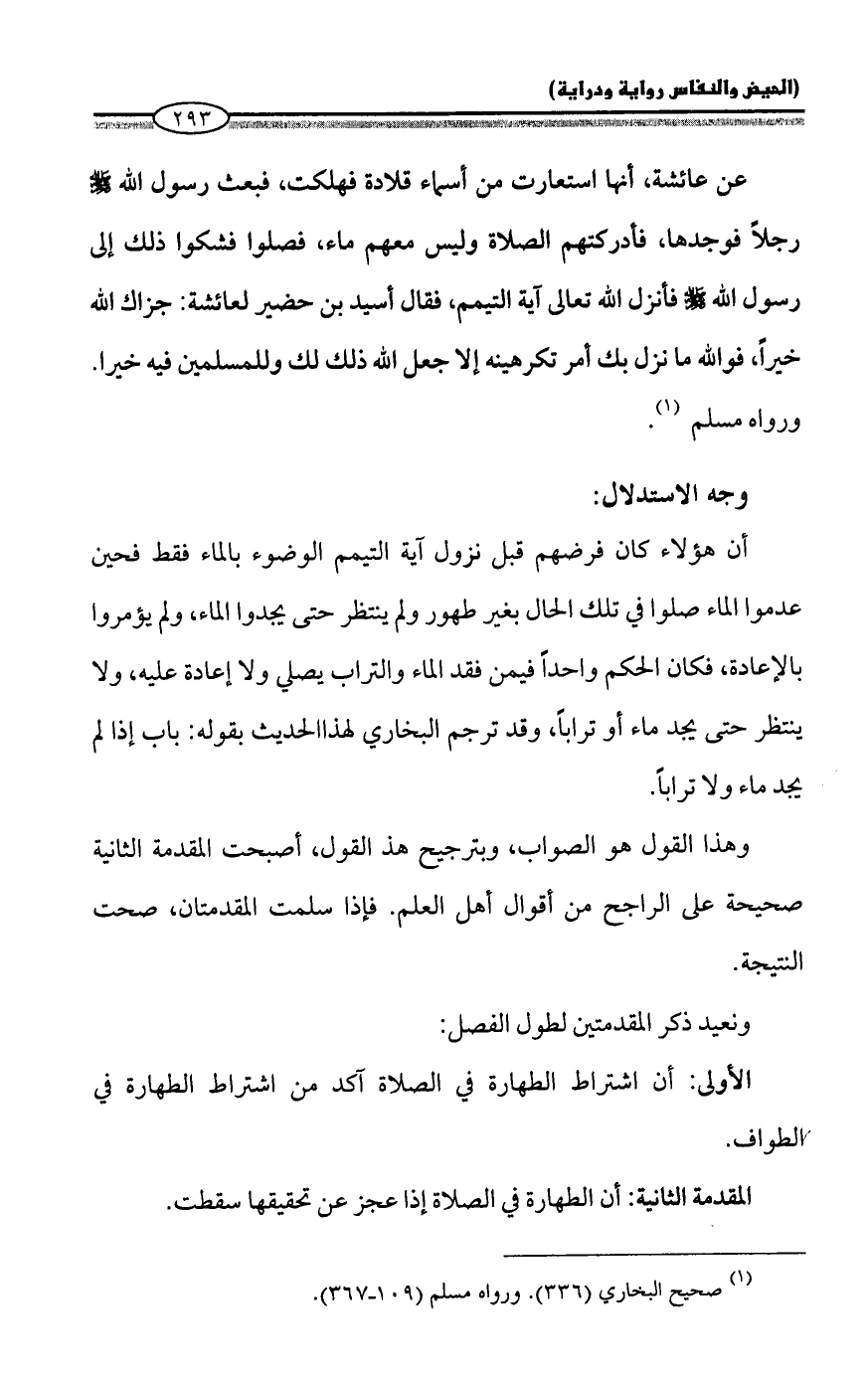 عن عائشة، أنها استعارت من أسماء قلادة فهلكت، فبعث رسول الله - صلى الله عليه وسلم - رجلاً فوجدها، فأدركتهم الصلاة وليس معهم ماء، فصلوا فشكوا ذلك إلى رسول الله - صلى الله عليه وسلم - فأنزل الله تعالى آية التيمم، فقال أسيد بن حضير لعائشة: جزاك الله خيراً، فوالله ما نزل بك أمر تكرهينه إلا جعل الله ذلك لك وللمسلمين فيه خيرا. ورواه مسلم (¬1).