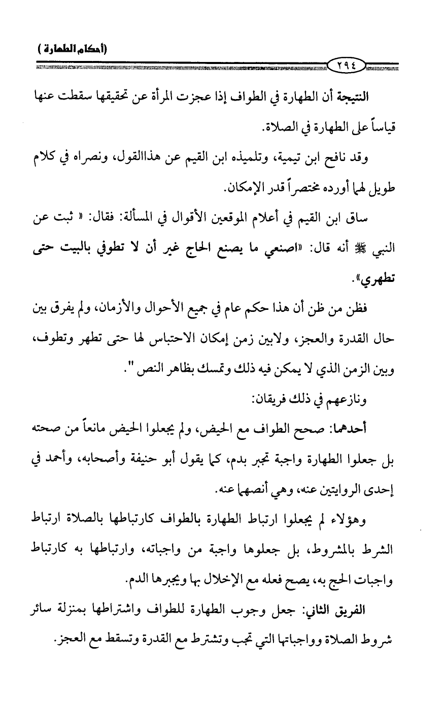 النتيجة أن الطهارة في الطواف إذا عجزت المرأة عن تحقيقها سقطت عنها قياساً على الطهارة في الصلاة.