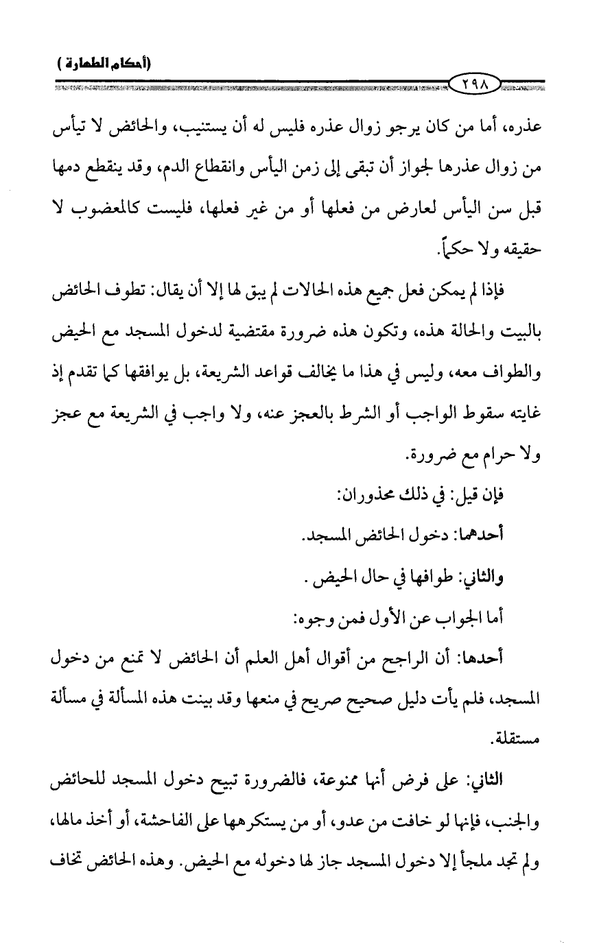 فإذا لم يمكن فعل جميع هذه الحالات لم يبق لها إلا أن يقال: تطوف الحائض بالبيت والحالة هذه، وتكون هذه ضرورة مقتضية لدخول المسجد مع الحيض والطواف معه، وليس في هذا ما يخالف قواعد الشريعة، بل يوافقها كما تقدم إذ غايته سقوط الواجب أو الشرط بالعجز عنه، ولا واجب في الشريعة مع عجز ولا حرام مع ضرورة.