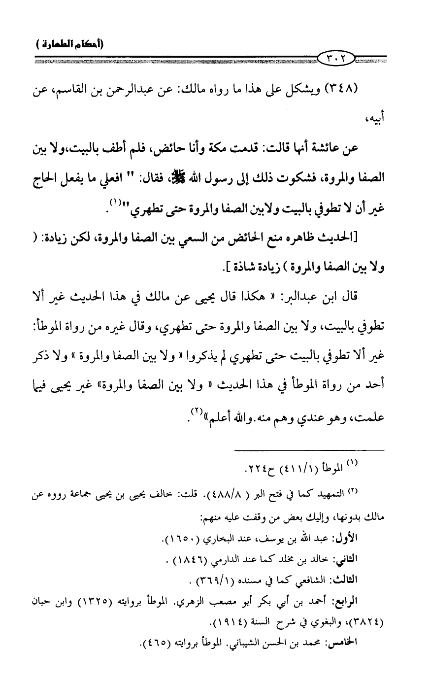 قال ابن عبد البر: "هكذا قال يحيى عن مالك في هذا الحديث غير ألا تطوفي بالبيت، ولا بين الصفا والمروة حتى تطهري، وقال غيره من رواة الموطأ: غير ألا تطوفي بالبيت حتى تطهري لم يذكروا "ولا بين الصفا والمروة" ولا ذكر أحد من رواة الموطأ في هذا الحديث "ولا بين الصفا والمروة" غير يحيى فيما علمت، وهو عندي وهم منه. والله أعلم" (¬2).