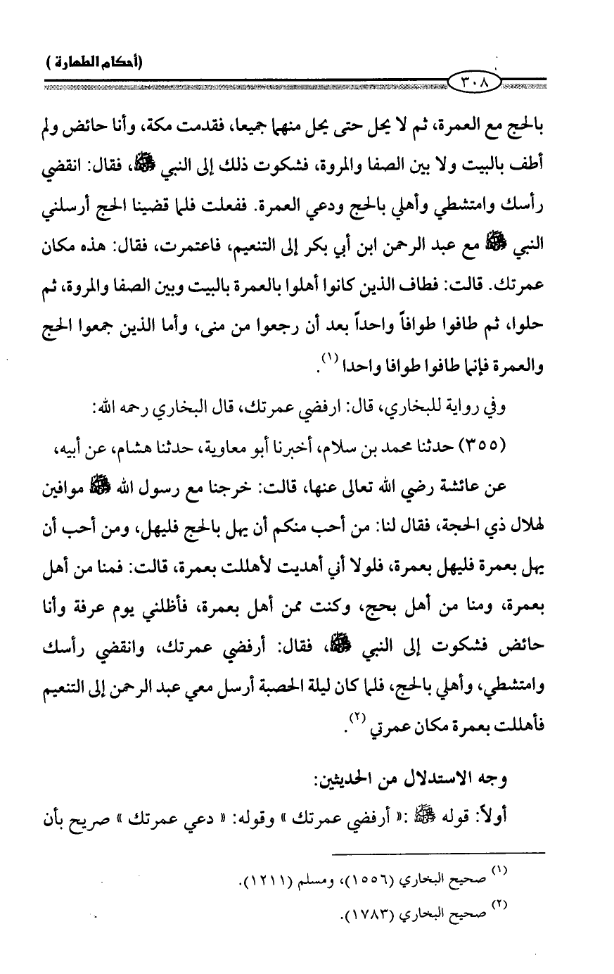 عن عائشة رضي الله تعالى عنها، قالت: خرجنا مع رسول الله - صلى الله عليه وسلم - موافين لهلال ذي الحجة، فقال لنا: من أحب منكم أن يهل بالحج فليهل، ومن أحب أن يهل بعمرة فليهل بعمرة، فلولا أني أهديت لأهللت بعمرة، قالت: فمنا من أهل بعمرة، ومنا من أهل بحج، وكنت ممن أهل بعمرة، فأظلني يوم عرفة وأنا حائض فشكوت إلى النبي - صلى الله عليه وسلم -، فقال: أرفضي عمرتك، وانقضي رأسك وامتشطي، وأهلي بالحج، فلما كان ليلة الحصبة أرسل معي عبد الرحمن إلى التنعيم فأهللت بعمرة مكان عمرتي (¬2).