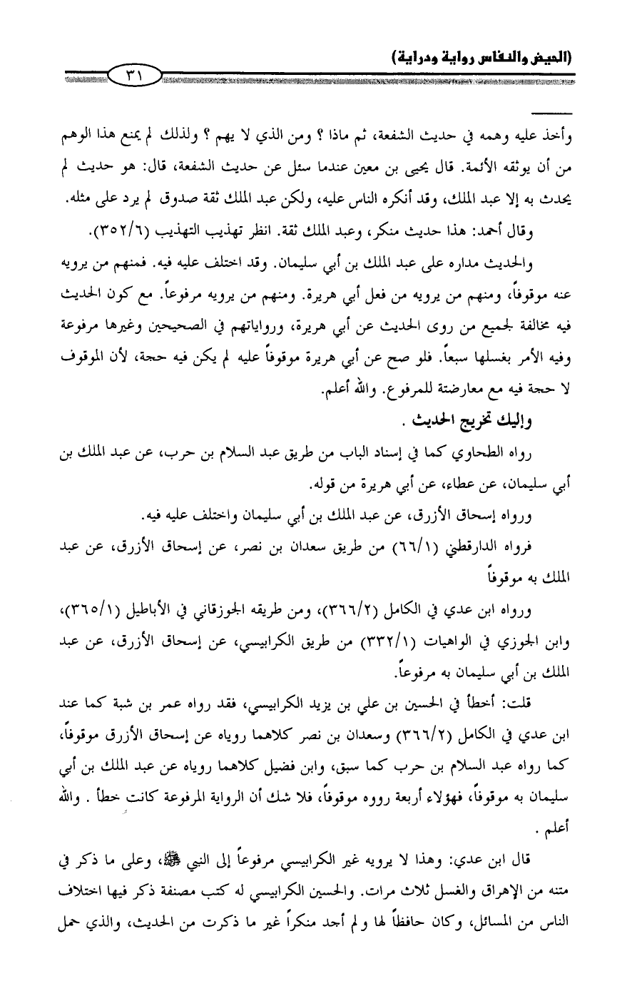 قلت: أخطأ في الحسين بن علي بن يزيد الكرابيسي، فقد رواه عمر بن شبة كما عند ابن عدي في الكامل (2/ 366) وسعدان بن نصر كلاهما روياه عن إسحاق الأزرق موقوفاً، كما رواه عبد السلام بن حرب كما سبق، وابن فضيل كلاهما روياه عن عبد الملك بن أبي سليمان به موقوفاً، فهؤلاء أربعة رووه موقوفاً، فلا شك أن الرواية المرفوعة كانت خطأ. والله أعلم.