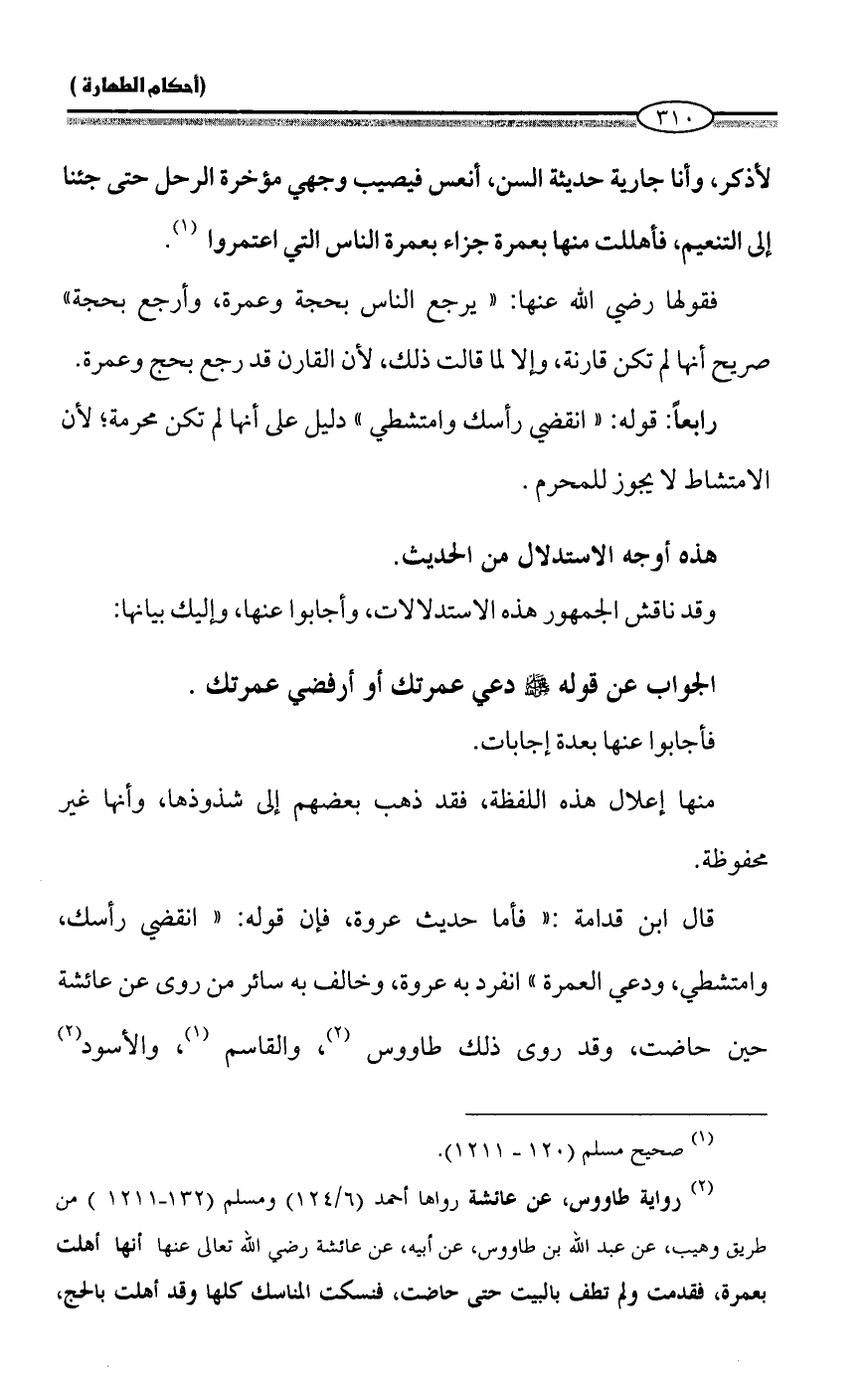 (¬2) رواية طاووس، عن عائشة رواها أحمد (6/ 124) ومسلم (132 - 1211) من طريق وهيب، عن عبد الله بن طاووس، عن أبيه، عن عائشة رضي الله تعالى عنها أنها أهلت بعمرة، فقدمت ولم تطف بالبيت حتى حاضت، فنسكت المناسك كلها وقد أهلت بالحج،