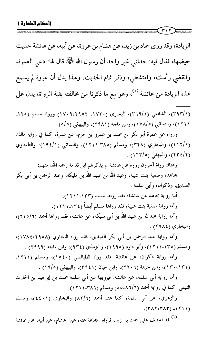 الزيادة، وقد روى حماد بن زيد، عن هشام بن عروة، عن أبيه، عن عائشة حديث حيضها، فقال فيه: حدثني غير واحد أن رسول الله - صلى الله عليه وسلم - قال لها: دعي العمرة، وانقضي رأسك، وامتشطي، وذكر تمام الحديث. وهذا يدل أن عروة لم يسمع هذه الزيادة من عائشة (¬1)، وهو مع ما ذكرنا من مخالفته بقية الرواة، يدل على