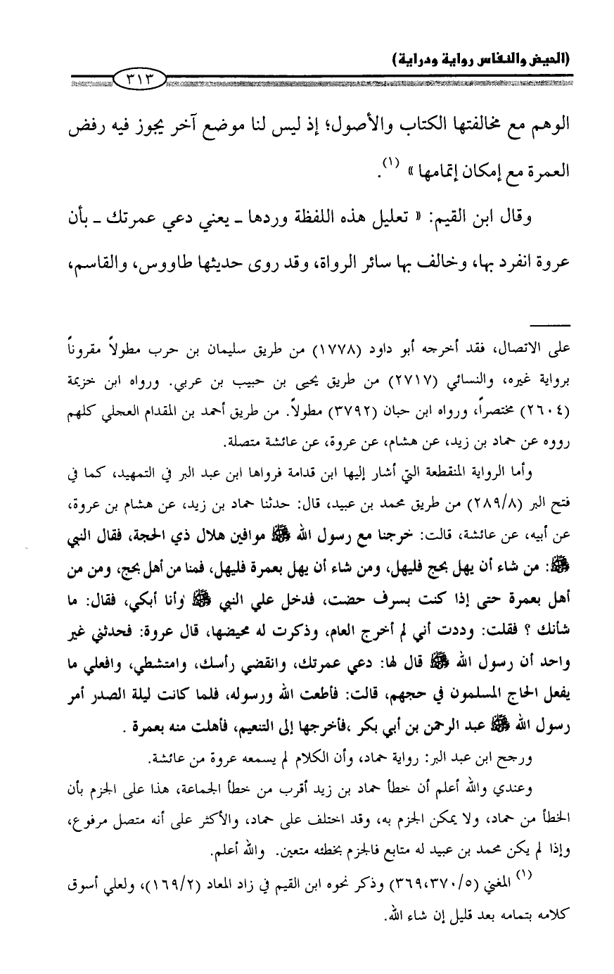 وقال ابن القيم: "تعليل هذه اللفظة وردها - يعني دعي عمرتك - بأن عروة انفرد بها، وخالف بها سائر الرواة، وقد روى حديثها طاووس، والقاسم،