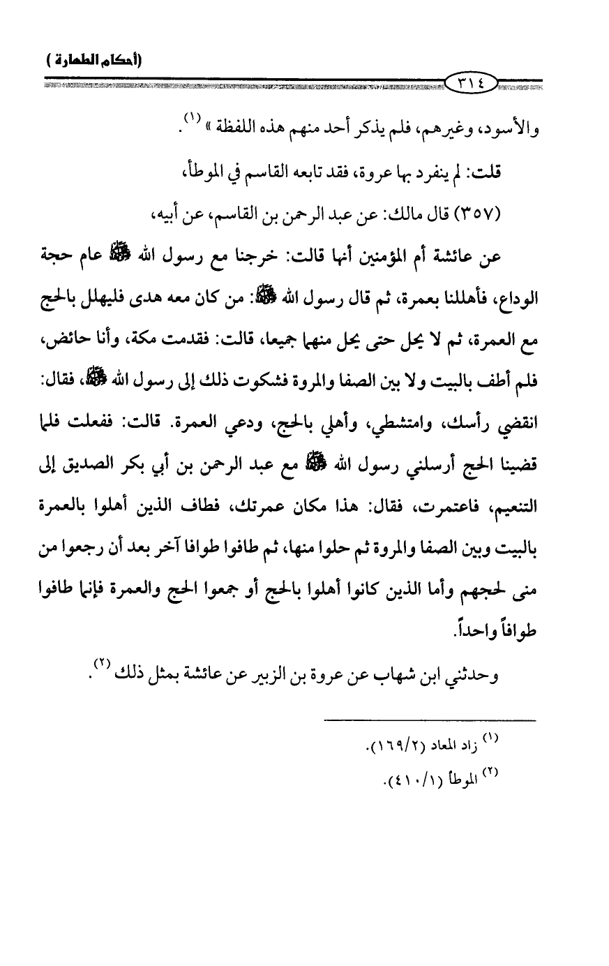 عن عائشة أم المؤمنين أنها قالت: خرجنا مع رسول الله - صلى الله عليه وسلم - عام حجة الوداع، فأهللنا بعمرة، ثم قال رسول الله - صلى الله عليه وسلم -: من كان معه هدى فليهلل بالحج مع العمرة، ثم لا يحل حتى يحل منهما جميعاً، قالت: فقدمت مكة، وأنا حائض، فلم أطف بالبيت ولا بين الصفا والمروة فشكوت ذلك إلى رسول الله - صلى الله عليه وسلم -، فقال: انقضي رأسك، وامتشطي، وأهلي بالحج، ودعي العمرة. قالت: ففعلت فلما قضينا الحج أرسلني رسول الله - صلى الله عليه وسلم - مع عبد الرحمن بن أبي بكر الصديق إلى التنعيم، فاعتمرت، فقال: هذا مكان عمرتك، فطاف الذين أهلوا بالعمرة بالبيت وبين الصفا والمروة ثم حلوا منها، ثم طافوا طوافا آخر بعد أن رجعوا من منى لحجهم وأما الذين كانوا أهلوا بالحج أو جمعوا الحج والعمرة فإنما طافوا طوافاً واحداً.