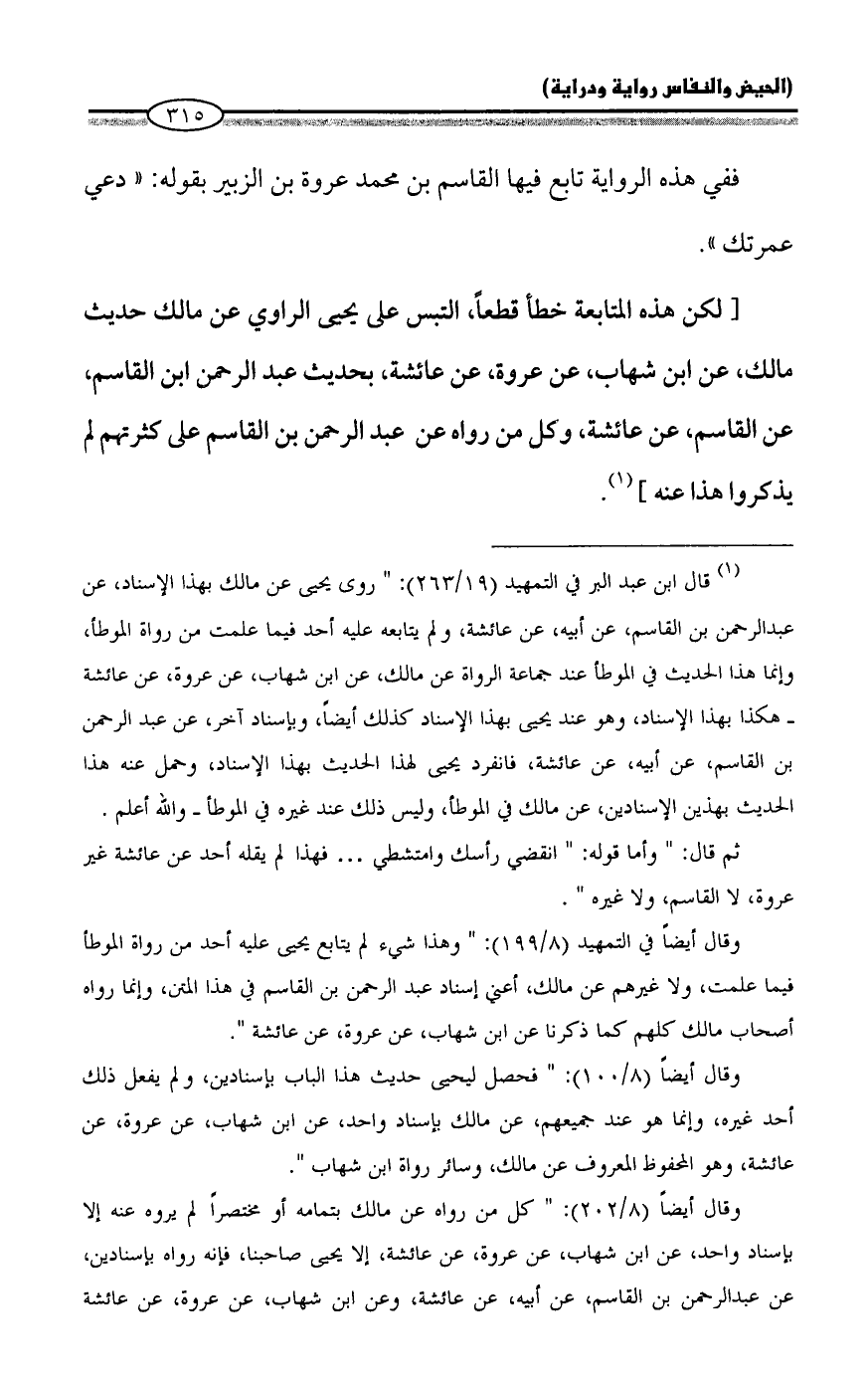 وقال أيضاً في التمهيد (8/ 199): "وهذا شيء لم يتابع يحيى عليه أحد من رواة الموطأ فيما علمت، ولا غيرهم عن مالك، أعني إسناد عبد الرحمن بن القاسم في هذا المتن، وإنما رواه أصحاب مالك كلهم كما ذكرنا عن ابن شهاب، عن عروة، عن عائشة".