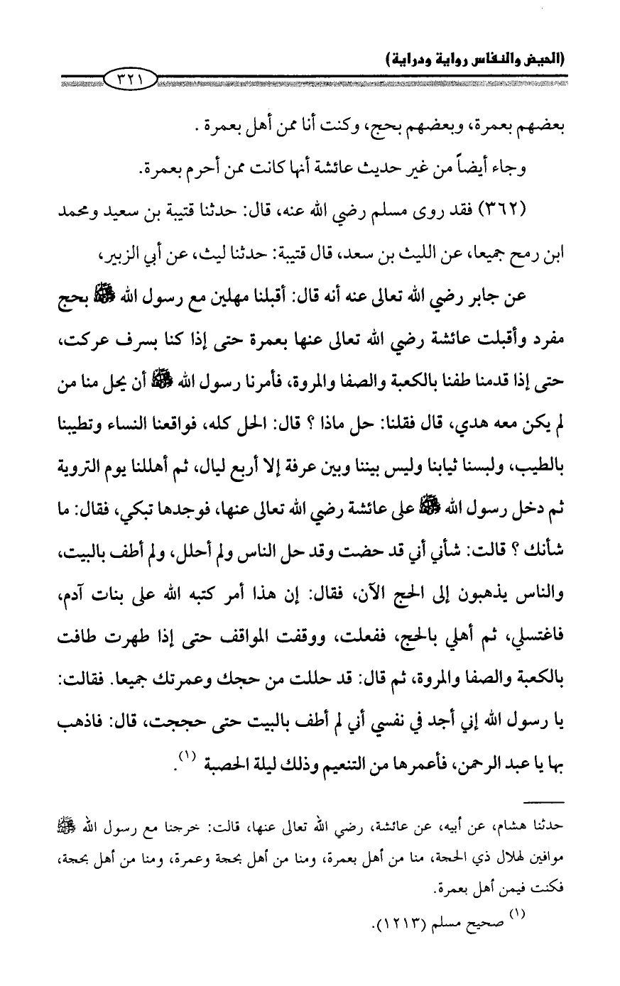 عن جابر رضي الله تعالى عنه أنه قال: أقبلنا مهلين مع رسول الله - صلى الله عليه وسلم - بحج مفرد وأقبلت عائشة رضي الله تعالى عنها بعمرة حتى إذا كنا بسرف عركت، حتى إذا قدمنا طفنا بالكعبة والصفا والمروة، فأمرنا رسول الله - صلى الله عليه وسلم - أن يحل منا من لم يكن معه هدي، قال فقلنا: حل ماذا؟ قال: الحل كله، فواقعنا النساء وتطيبنا بالطيب، ولبسنا ثيابنا وليس بيننا وبين عرفة إلا أربع ليال، ثم أهللنا يوم التروية ثم دخل رسول الله - صلى الله عليه وسلم - على عائشة رضي الله تعالى عنها، فوجدها تبكي، فقال: ما شأنك؟ قالت: شأني أني قد حضت وقد حل الناس ولم أحلل، ولم أطف بالبيت، والناس يذهبون إلى الحج الآن، فقال: إن هذا أمر كتبه الله علي بنات آدم، فاغتسلي، ثم أهلي بالحج، ففعلت، ووقفت المواقف حتى إذا طهرت طافت بالكعبة والصفا والمروة، ثم قال: قد حللت من حجك وعمرتك جميعا. فقالت: يا رسول الله إني أجد في نفسي أني لم أطف بالبيت حتى حججت، قال: فاذهب بها يا عبد الرحمن، فأعمرها من التنعيم وذلك ليلة الحصبة (¬1).