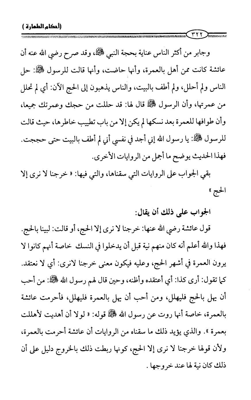 وجابر من أكثر الناس عناية بحجة النبي - صلى الله عليه وسلم -، وقد صرح رضي الله عنه أن عائشة كانت ممن أهل بالعمرة، وأنها حاضت، وأنها قالت للرسول - صلى الله عليه وسلم -: حل الناس ولم أحلل، ولم أطف بالبيت، والناس يذهبون إلى الحج الآن: أي لم تحلل من عمرتها، وأن الرسول - صلى الله عليه وسلم - قال لها: قد حللت من حجك وعمرتك جميعاً، وأن طوافها للعمرة بعد نسكها لم يكن إلا من باب تطييب خاطرها، حيث قالت للرسول - صلى الله عليه وسلم -: يا رسول الله إني أجد في نفسي أني لم أطف بالبيت حتى حججت. فهذا الحديث يوضح ما أجمل من الروايات الأخرى.