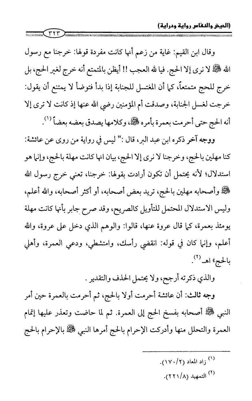 وقال ابن القيم: غاية من زعم أنها كانت مفردة قولها: خرجنا مع رسول الله - صلى الله عليه وسلم - لا نرى إلا الحج. فيا لله العجب!! أيظن بالمتمتع أنه خرج لغير الحج، بل خرج للحج متمتعاً، كما أن المغتسل للجنابة إذا بدأ فتوضأ لا يمتنع أن يقول: خرجت لغسل الجنابة، وصدقت أم المؤمنين رضي الله عنها إذ كانت لا ترى إلا أنه الحج حتى أحرمت بعمرة بأمره - صلى الله عليه وسلم -، وكلامها يصدق بعضه بعضاً (¬1).