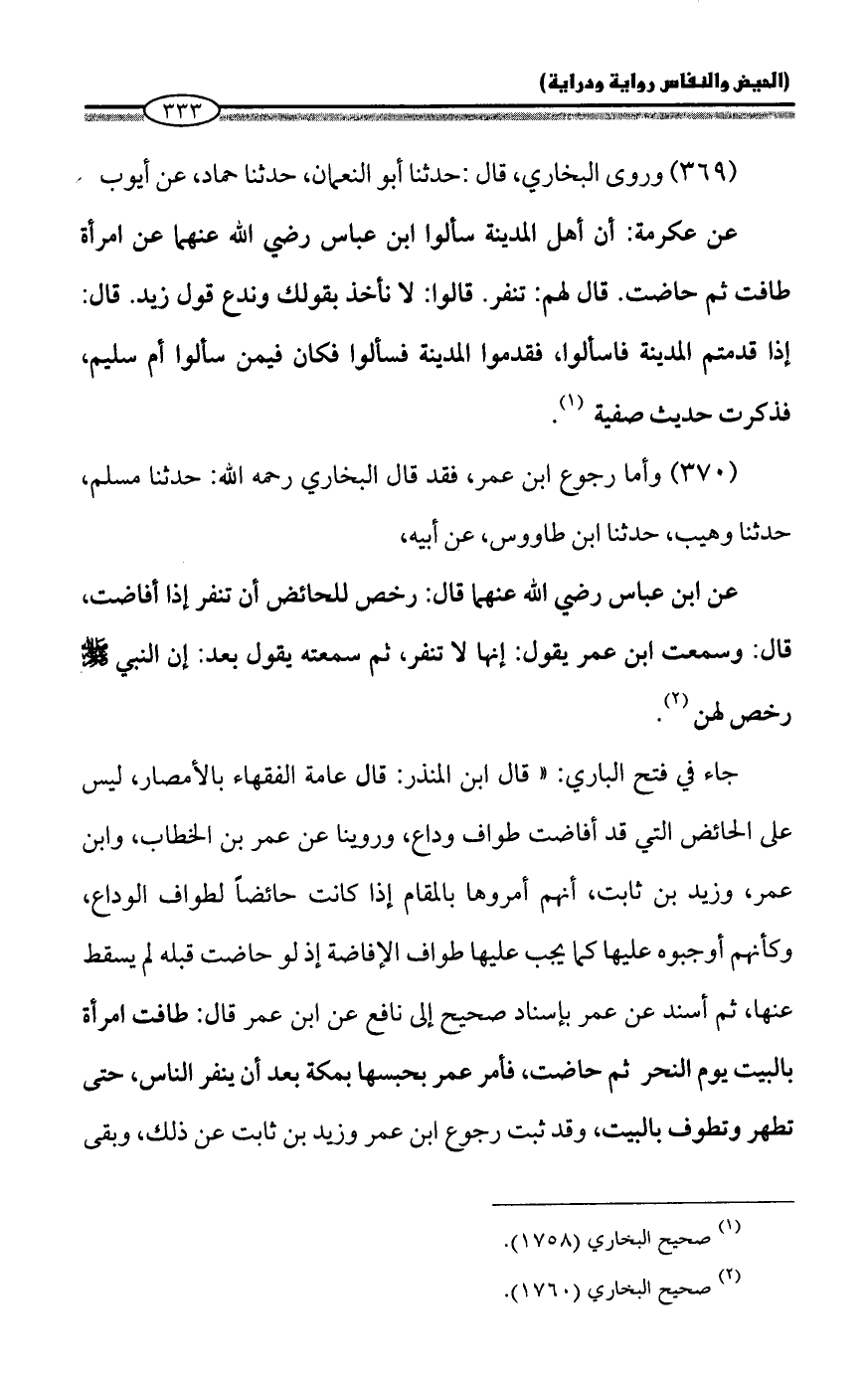 (369) وروى البخاري، قال: حدثنا أبو النعمان، حدثنا حماد، عن أيوب عن عكرمة: أن أهل المدينة سألوا ابن عباس رضي الله عنهما عن امرأة طافت ثم حاضت. قال لهم: تنفر. قالوا: لا نأخذ بقولك وناع قول زيد. قال: إذا قدمتم المدينة فاسألوا، فقدموا المدينة فسألوا فكان فيمن سألوا أم سليم، فذكرت حديث صفية (¬1).