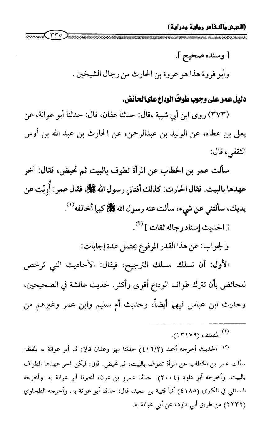 دليل عمر على وجوب طواف الوداع على الحائض.