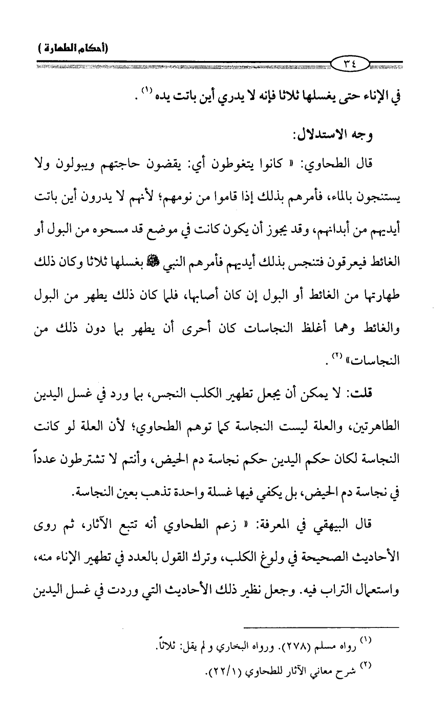 قلت: لا يمكن أن يجعل تطهير الكلب النجس، بما ورد في غسل اليدين الطاهرتين، والعلة ليست النجاسة كما توهم الطحاوي؛ لأن العلة لو كانت النجاسة لكان حكم اليدين حكم نجاسة دم الحيض، وأنتم لا تشترطون عدداً في نجاسة دم الحيض، بل يكفي فيها غسلة واحدة تذهب بعين النجاسة.