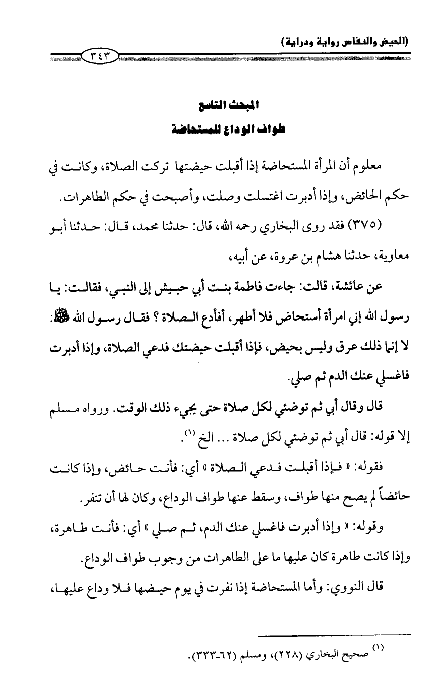 قال النووي: وأما المستحاضة إذا نفرت في يوم حيضها فلا وداع عليها،