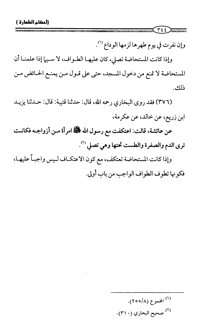 وإذا كانت المستحاضة تصلي، كان عليها الطواف، لا سيما إذا علمنا أن المستحاضة لا تمنع من دخول المسجد، حتى على قول من يمنع الحائض من ذلك.