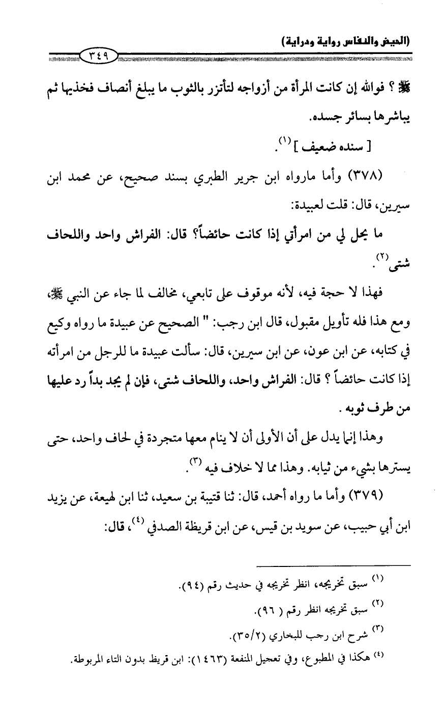 فهذا لا حجة فيه, لأنه موقوف على تابعي، مخالف لما جاء عن النبي - صلى الله عليه وسلم -، ومع هذا فله تأويل مقبول، قال ابن رجب: "الصحيح عن عبيدة ما رواه وكيع في كتابه، عن ابن عون، عن ابن سيرين، قال: سألت عبيدة ما للرجل من امرأته إذا كانت حائضاً؟ قال: الفراش واحد، واللحاف شتى، فإن لم يجد بداً رد عليها من طرف ثوبه.