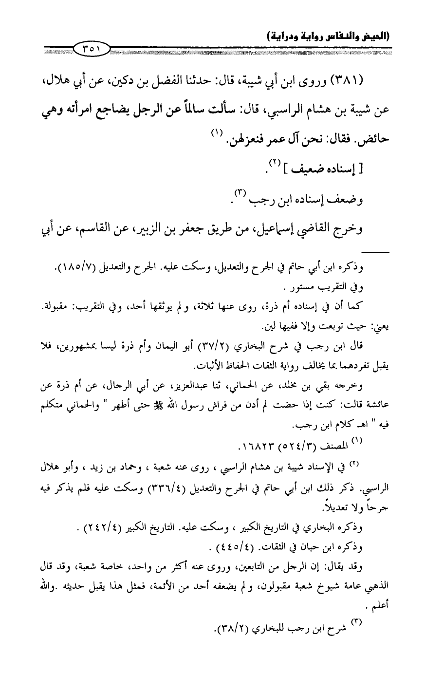 (381) وروى ابن أبي شيبة، قال: حدثنا الفضل بن دكين، عن أبي هلال، عن شيبة بن هشام الراسبي، قال: سألت سالماً عن الرجل يضاجع امرأته وهي حائض. فقال: نحن آل عمر فنعزلهن. (¬1)