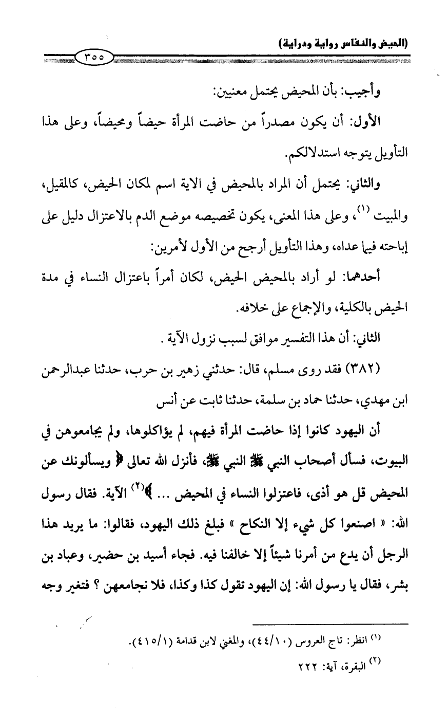 أن اليهود كانوا إذا حاضت المرأة فيهم، لم يؤاكلوها، ولم يجامعوهن في البيوت، فسأل أصحاب النبي - صلى الله عليه وسلم - النبي - صلى الله عليه وسلم -، فأنزل الله تعالى {وَيَسْأَلُونَكَ عَنِ الْمَحِيضِ قُلْ هُوَ أَذًى فَاعْتَزِلُوا النِّسَاءَ فِي الْمَحِيضِ ...} (¬2) الآية. فقال رسول الله: "اصنعوا كل شيء إلا النكاح" فبلغ ذلك اليهود، فقالوا: ما يريد هذا الرجل أن يدع من أمرنا شيئاً إلا خالفنا فيه. فجاء أسيد بن حضير، وعباد بن بشر، فقال يا رسول الله: إن اليهود تقول كذا وكذا، فلا نجامعهن؟ فتغير وجه